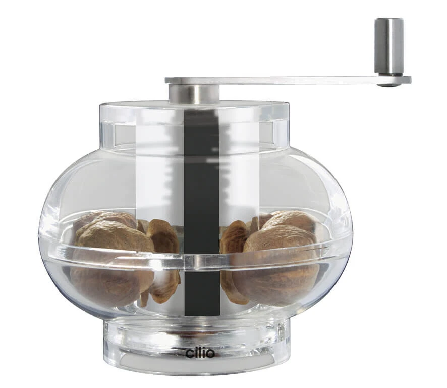 De Cilio nootmuskaatmolen is vervaardigd uit kunststof en roestvrij staal. Het speciale mechanisme stelt zichzelf zo af dat de muskaatnoot met gelijkmatige kracht tegen de messen aangedrukt wordt. In de behuizing kunnen meerdere muskaatnoten bewaard worden.