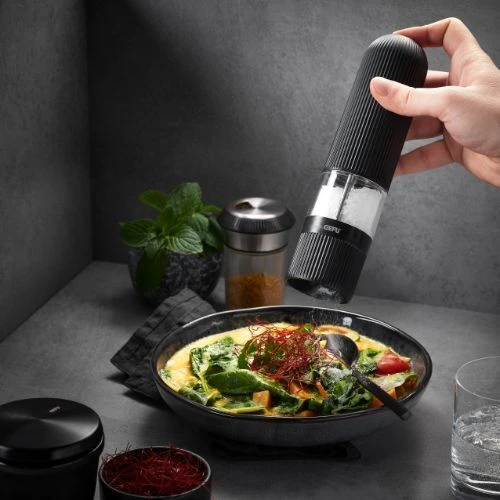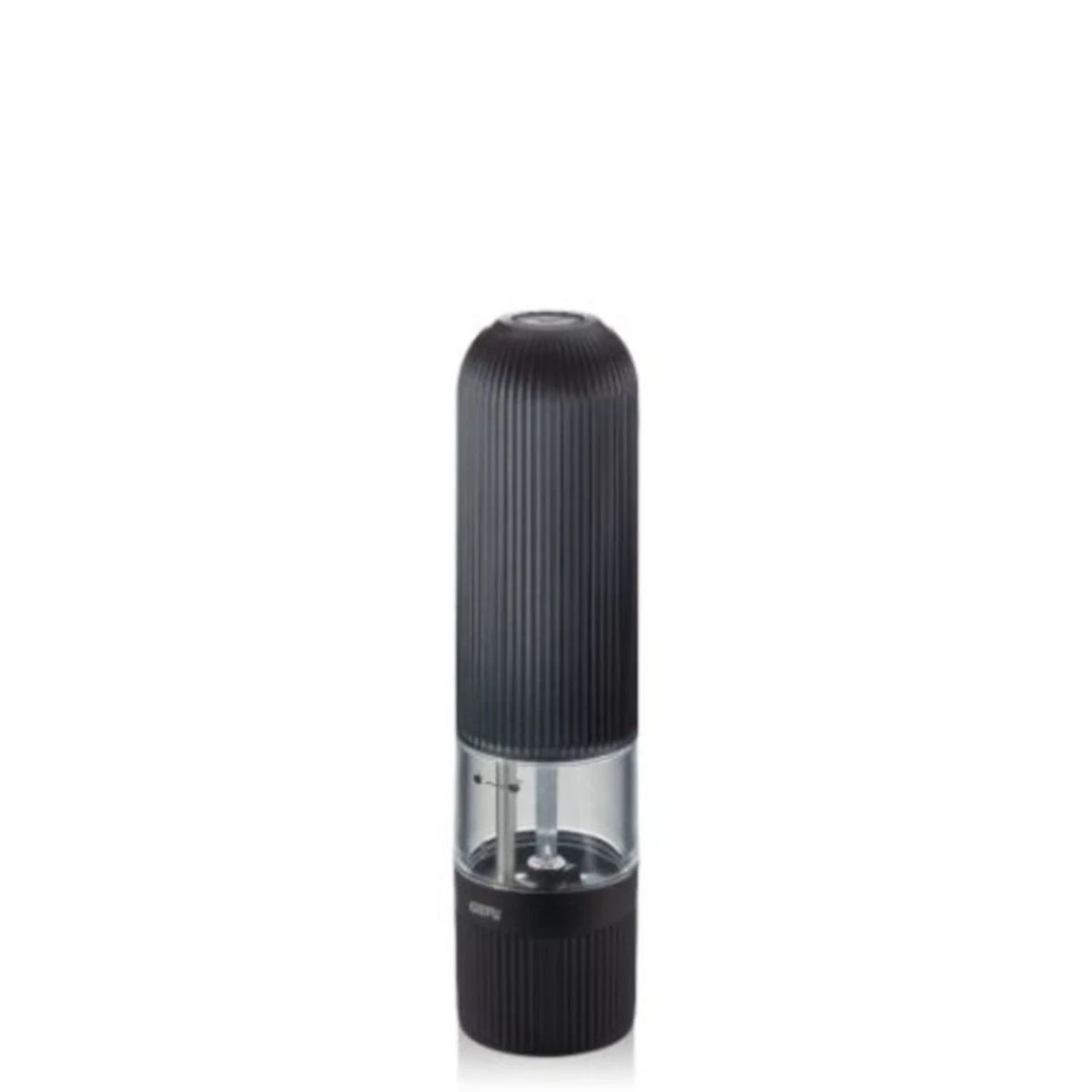 Gebruik de Gefu zout- of pepermolen voor het malen van zout of peper. De molen is gemakkelijk te bedienen en bij te vullen en werkt op 6 AAA-batterijen, deze zijn inbegrepen. Reinig de molen eventueel met een licht vochtige doek, zorg ervoor dat het maalwerk niet nat wordt.
