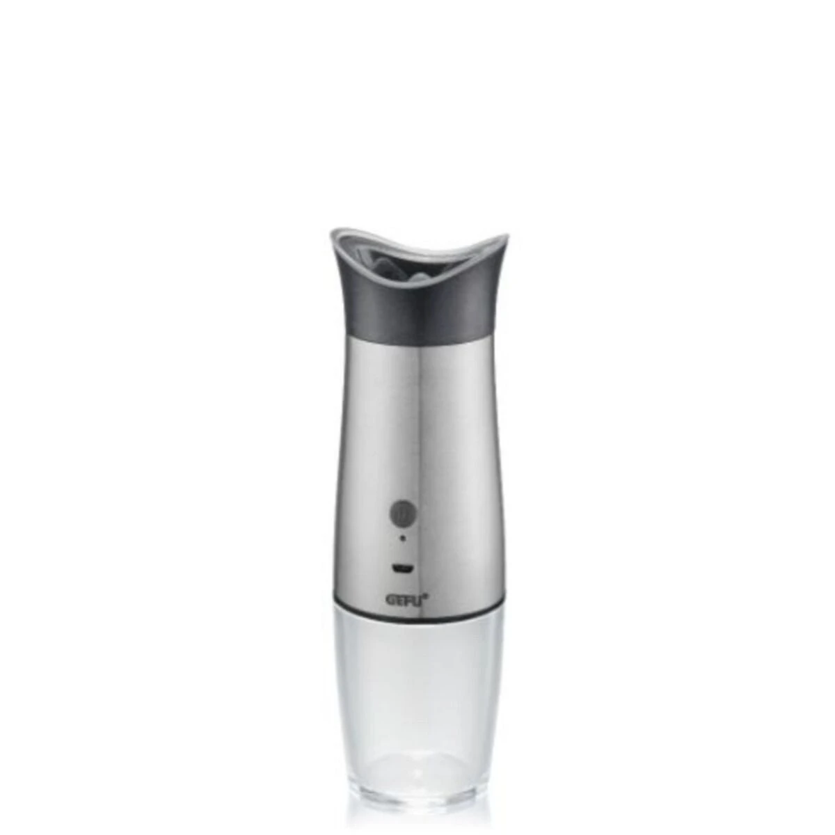 Gebruik de Gefu zout- of pepermolen voor het malen van zout of peper> De molen is gemakkelijk te bedienen en bij te vullen en is oplaadbaar via een USB-kabel. Reinig de zout- of pepermolen eventueel met een licht vochtige doek, zorg dat er geen water in het maalwerk komt.