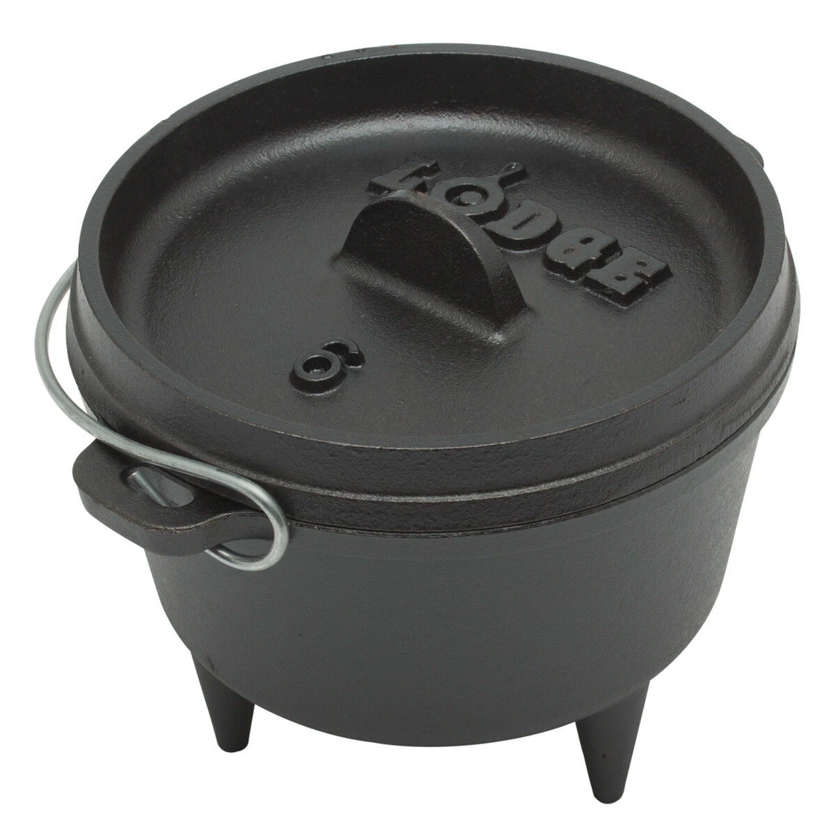 De Lodge Logic Camp Dutch niet-geëmailleerde gietijzeren oven of braadpan heeft een diameter van 15,2 cm. De inhoud bedraagt 0,9 liter. In deze pan met roestvrijstalen hengsel en pootjes bereidt u voedsel op direct vuur, zoals een kampvuur.