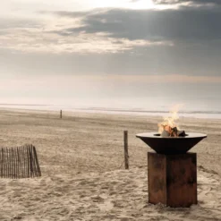 De OFYR is een vuurkorf, barbecue, kookplaat en plancha in één. In de centrale kegel stookt u met blokken haardhout een vuur dat de stalen ringvormige bakplaat heet genoeg opwarmt om er op te kunnen grillen, bakken en zelfs koken.
